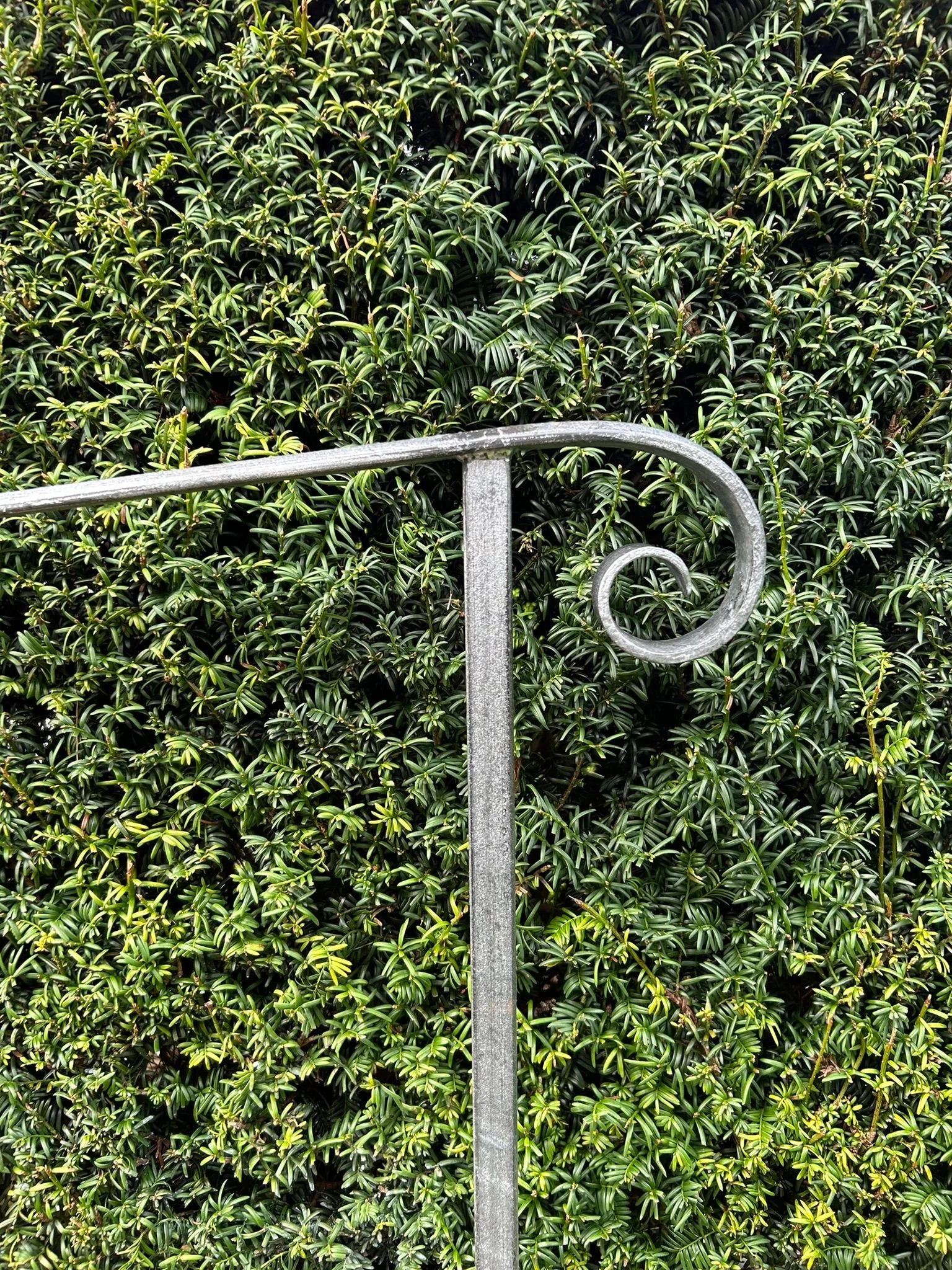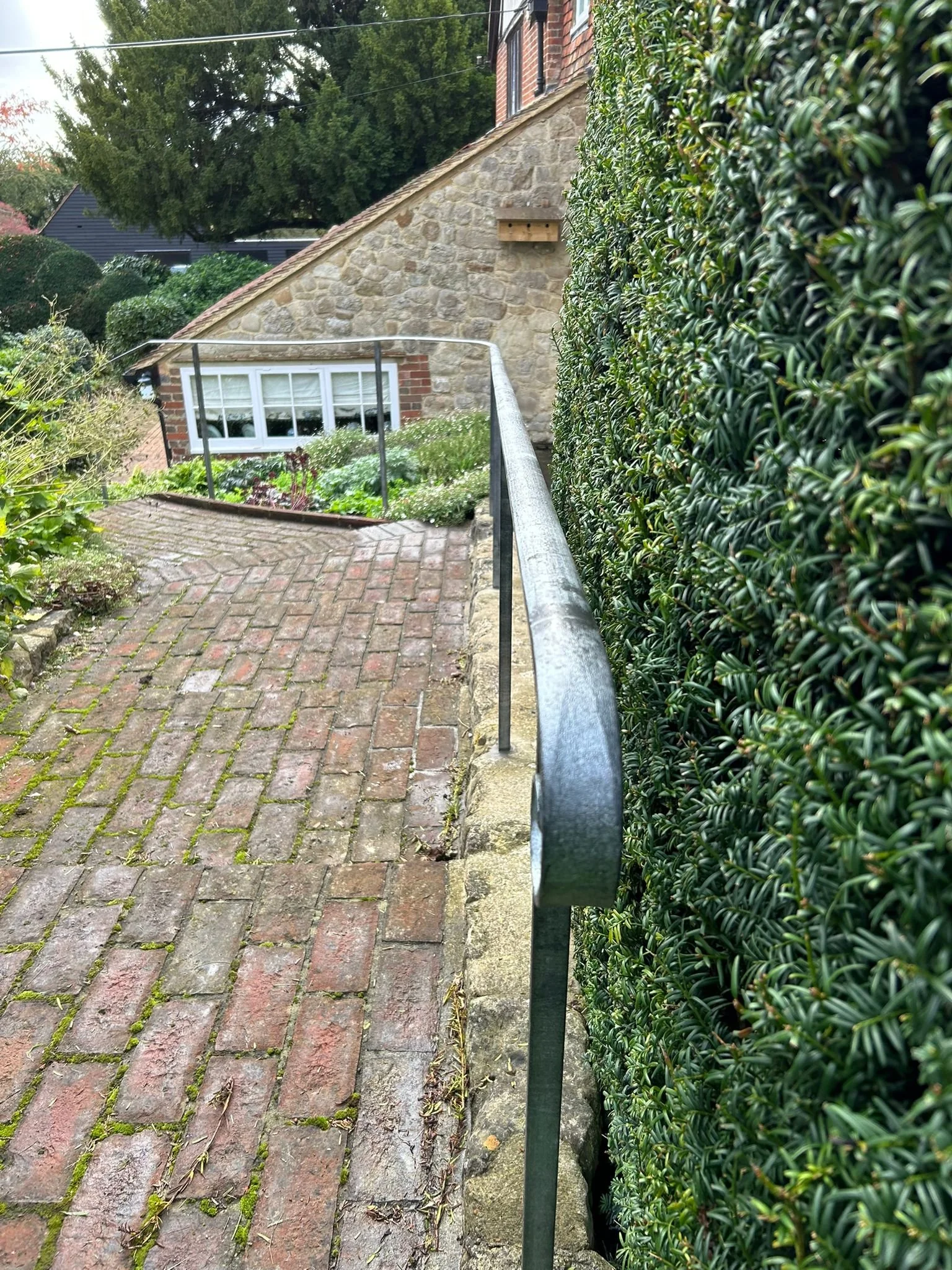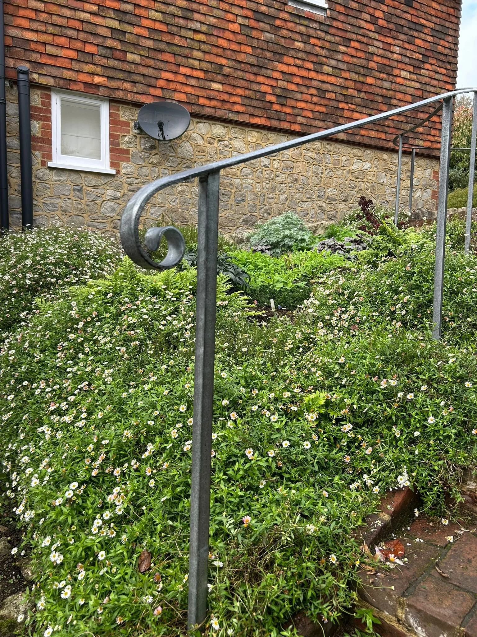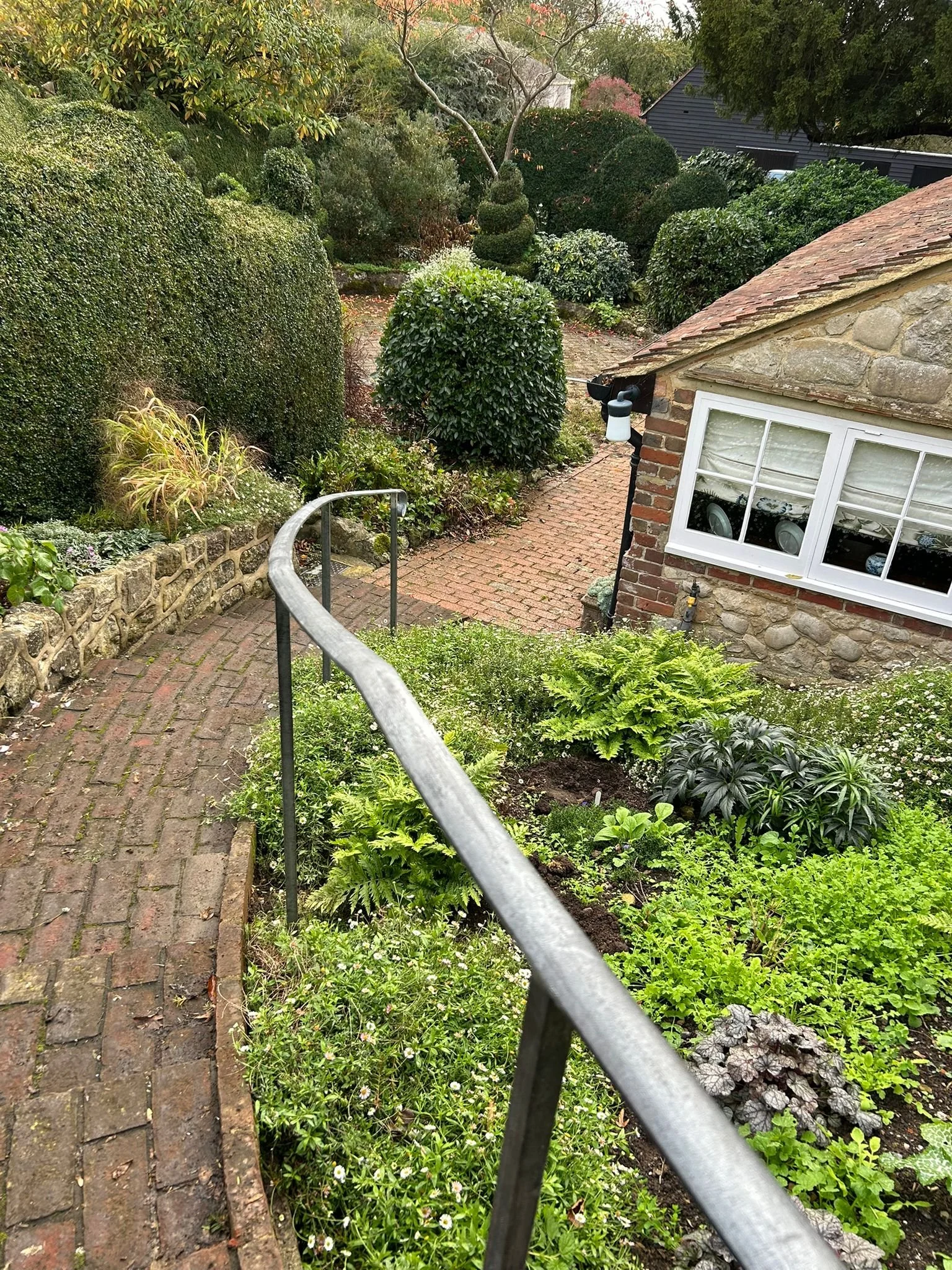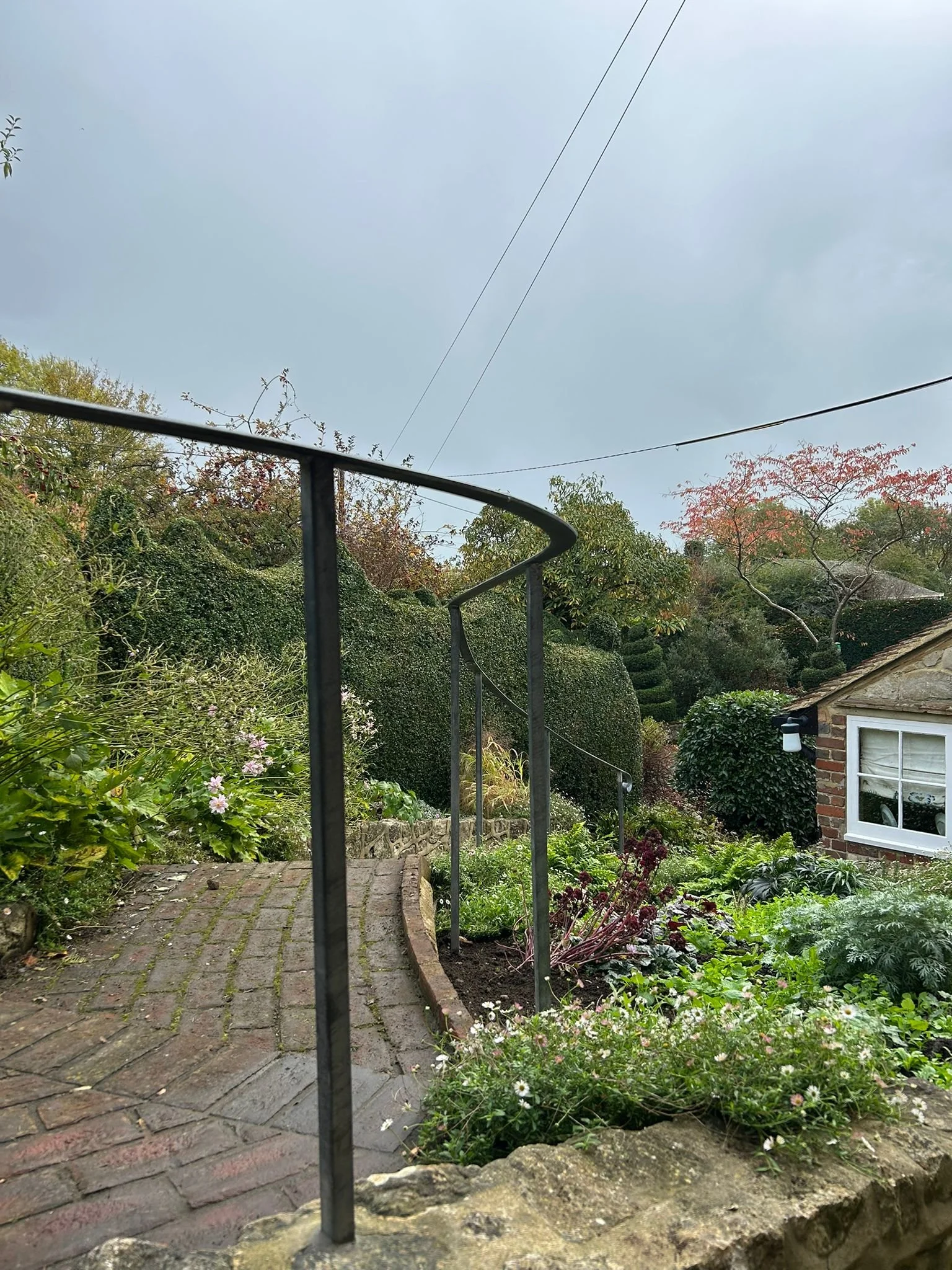 This beautifully crafted wrought iron handrail is designed to complement traditional garden paths and sloped walkways. With its gently curved form and subtle scroll detail at the end, it adds both character and functionality to outdoor spaces. The handrail is securely mounted into stone or brick walls, offering reliable support while following the natural contours of the landscape. Its weather-resistant, dark metal finish blends seamlessly with surrounding greenery and rustic architecture, making it an ideal choice for cottage gardens, historic homes, or terraced entrances. More than just a safety feature, this handrail is a tasteful addition that enhances the charm and structure of any garden pathway.