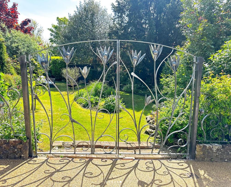 Introduce an artistic touch to your garden or outdoor space with this bespoke floral wrought iron gate and railing. Expertly handcrafted, this exquisite design showcases intricate floral motifs, including delicate metal blossoms and graceful vines that wind beautifully across the gate and railing. The organic flow of the design seamlessly blends with nature, enhancing the aesthetic appeal of any entrance or boundary.